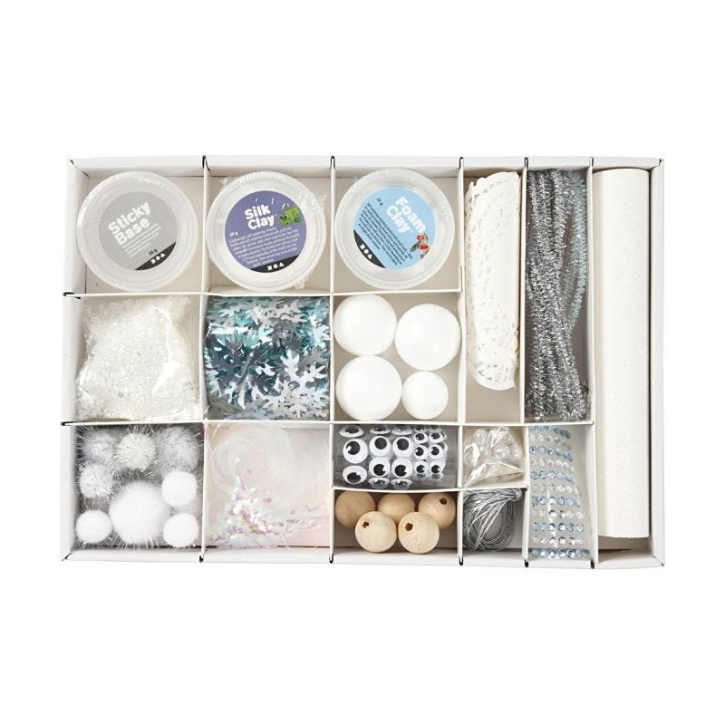Silk Clay, Foam Clay, Sticky Base, ojos saltones autoadhesivos en diferentes tamaños, cuentas de madera, chenilla, tapetes, papel brillante, bolas de espuma de poliestireno en diferentes tamaños, cordón plateado, cuentas de colores del arco iris, pedrería autoadhesiva en colores surtidos, lametta de color arcoiris (tinsel), pompones en colores surtidos y tamaños, nieve artificial y lentejuelas en colores surtidos y tamaños
