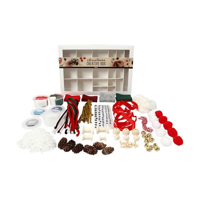 Silk Clay, Foam Clay, Sticky Base, ojos saltones autoadhesivos en diferentes tamaños, chenilla en colores surtidos, pompones en solores surtidos, cinta de seda, limpia pipas de metal, campanas en diferentes tamaños, piñas, cuentas de madera en diferentes tamaños, hilo de algodón, hilo poliacrílico gigante, láminas de fieltro en colores surtidos, nieve artificial, carretes de algodón de madera en diferentes tamaños