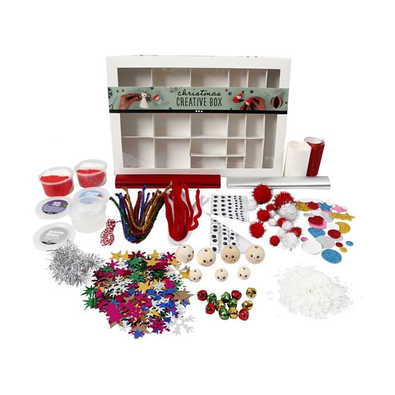 Silk Clay, Foam Clay, Sticky Base, ojos saltones autoadhesivos en diferentes tamaños, limpia pipas en colores surtidos, campanas en colores surtidos, papel metálico, hilo de algodón, metal lametta, círculos de goma EVa con purpurina, cuentas pintadas en diferentes tamaños, papel brillante, pompones en diferentes colores y medidas, nieve artificial y lentejuelas en diferentes colores y tamaños