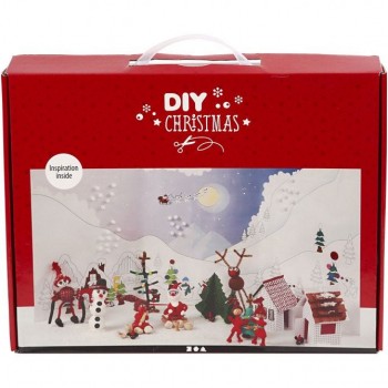 Contiene: tubo tejido, pompones, cabezas, zuecos, Silk Clay, goma EVA, trineo, bolas, ojos saltones, nieve, cartulina punto de cruz, papel de seda y rotuladores