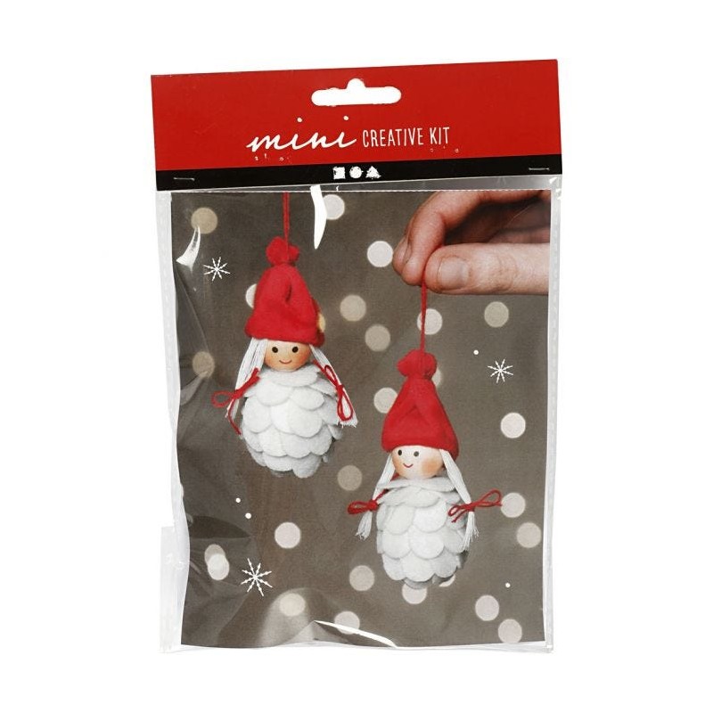 Contenido: terciopelo rojo perforado y fieltro blanco, cuerpos de espuma de poliestireno, caras de madera, cabello, hilo para colgar e hilo. Instrucciones incluidas. El tamaño indica las dimensiones del producto acabado.