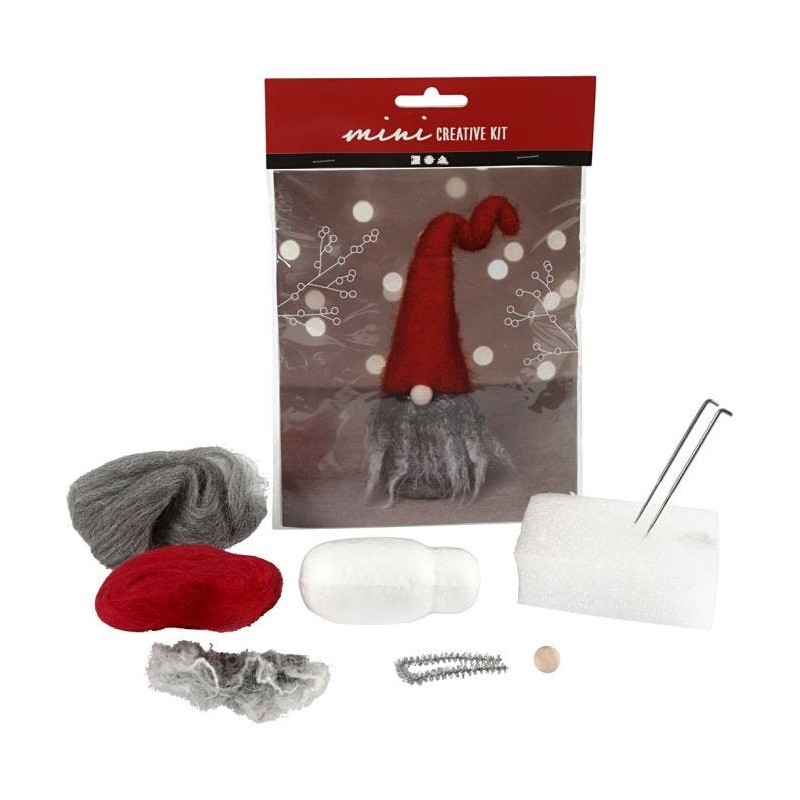Contenido: lana roja y gris, barba, cuentas de madera, cuerpo de espuma de poliestireno, aguja de fieltro y almohadilla de fieltro de aguja. Instrucciones incluidas. El tamaño indica las dimensiones del producto acabado.