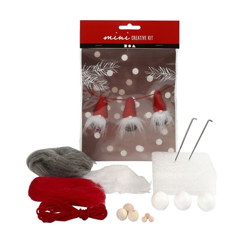Contenido: lana roja y gris, cuerpos de espuma de poliestireno, barba, cuentas de madera, aguja de fieltro, almohadilla de fieltro de aguja y cuerda para colgar. Instrucciones incluidas. El tamaño indica las dimensiones del producto acabado.