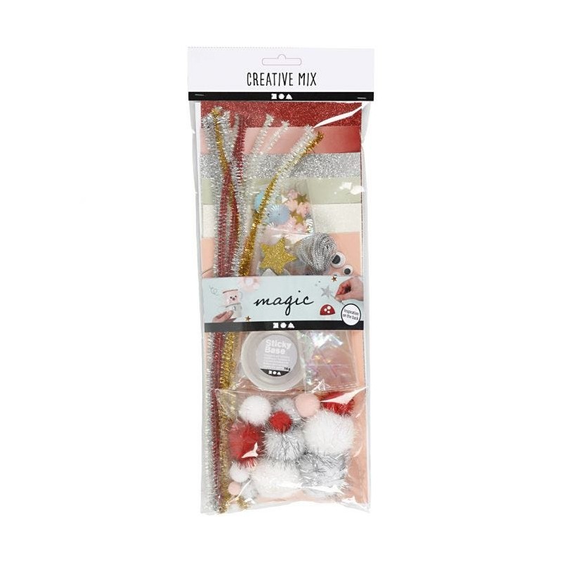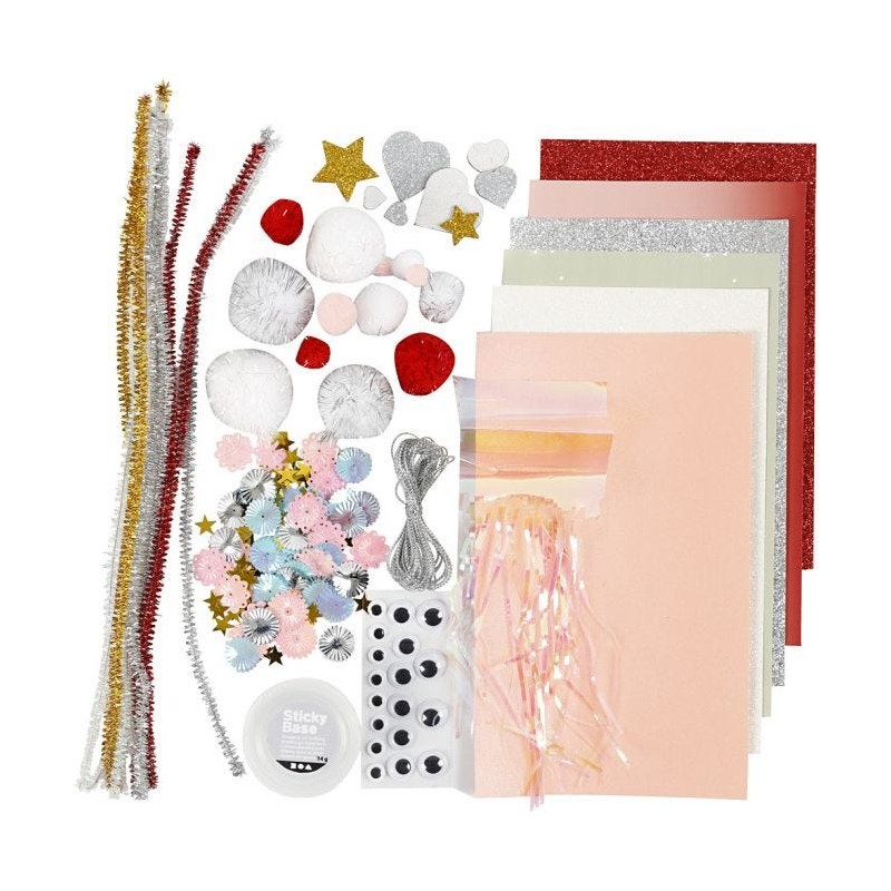 Contenido: Sticky Base, lentejuelas, pompones, papel brillante, papel estampado, limpiadores de tubos metálicos, lametta de celofán iridiscente, ojos saltarines autoadhesivos, cuerda de plata y figuras de espuma EVA con brillo.