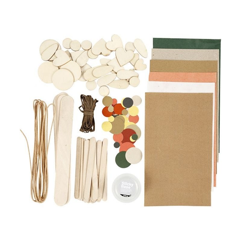 Contenido: Sticky Base, confeti de papel, cuerda de papel, cartón corrugado, hojas de papel natural, mosaicos de madera, alambre con papel, palos de hielo de madera en diferentes tamaños.