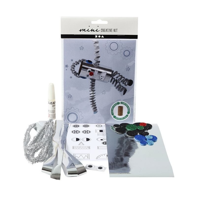 Kit de materiales para hacer un robot con brazos y piernas elástica hechos de tiras de papel doblado. El embalaje también se utiliza para hacer la figura. Añada su propio rollo de papel higiénico vacío. Instrucciones incluidas.