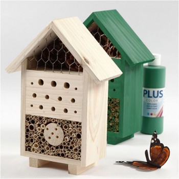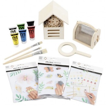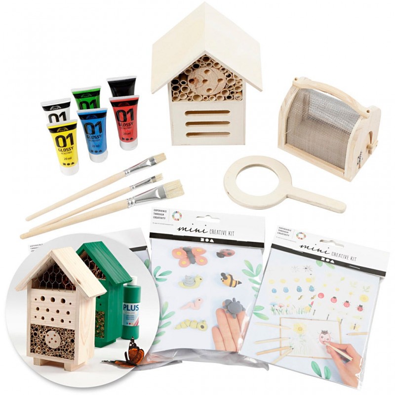 Contenido: hotel de insectos y mariposa, jaula para insectos, lupa, minikits creativos, pintura acrílica, pinceles