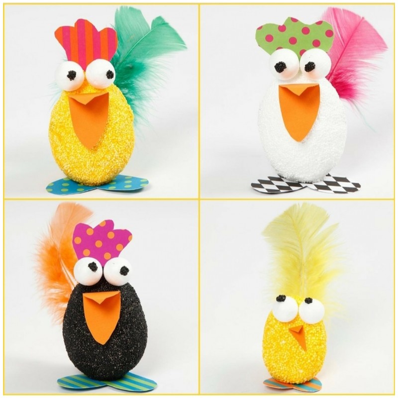 Contenido: Foma Clay en 3 colores surtidos , 6 huevos de poliespan, , 6 sets de ojos, para montar, plumas artificiales colores surtidos y cartulinas colores surtidos.