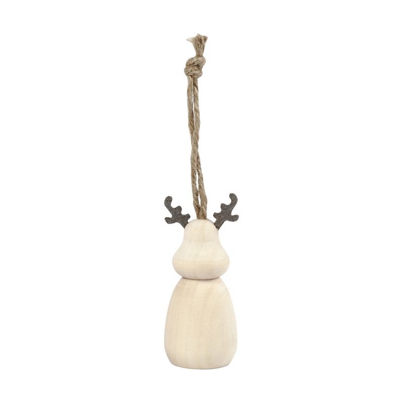 Reno de madera clara con cuernos de piel sintética y cuerda para colgar. También se puede poner de pie.