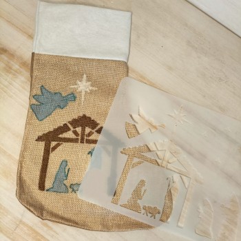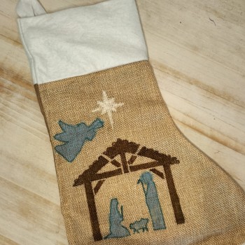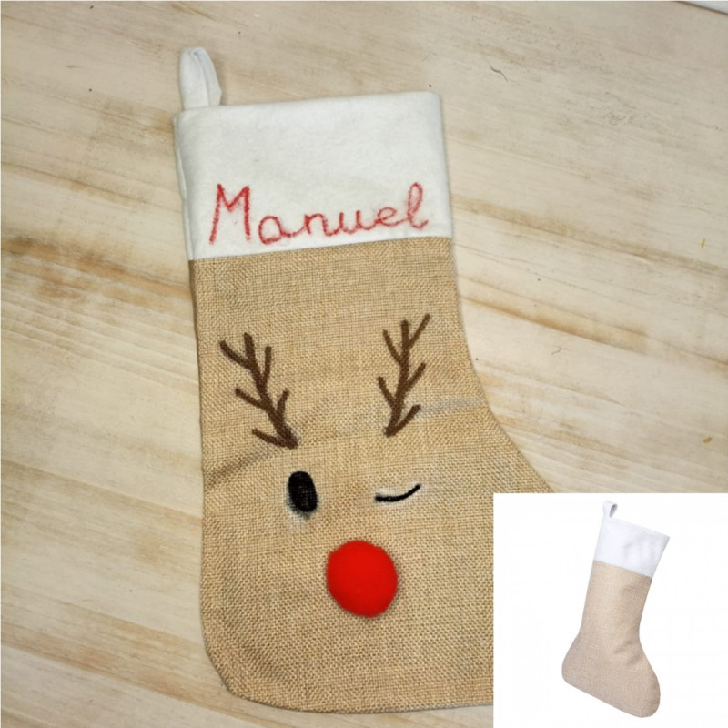 Calcetín navideño en combinación de colores natural y blanco. Incluye cinta para colgar, con amplia superficie de marcaje.