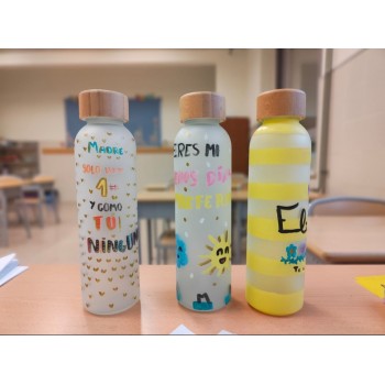 Bidón de línea nature y 500 ml de capacidad, con cuerpo fabricado en cristal, con tapón a rosca de bambú y libre de BPA. Disponible en variada gama de colores y presentado en caja individual de diseño eco.