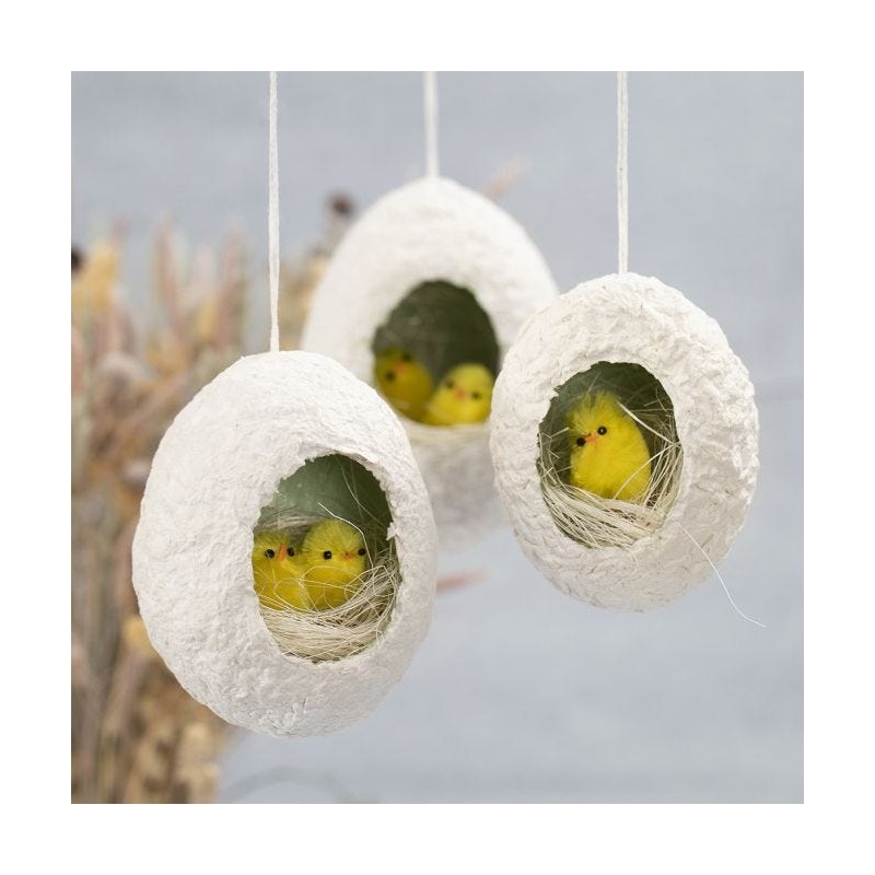 Huevo de papel maché hecho a mano con un agujero en un lado para insertarle varias decoraciones. Tiene un gancho en la parte superior para colgarlo.Ficha técnica