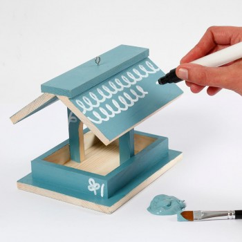 Kit de material para montar un comedero para pájaros de madera clara. Incluye instrucciones.Ficha técnica