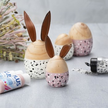 Huevo en madera clara con base plana para que pueda aguanterse y con orejas de imitación de piel