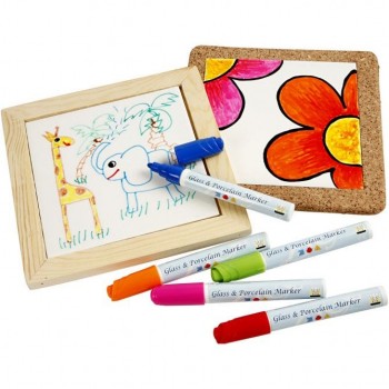 Contenido: 30 uds de azulejos de porcelana en marcos surtidos de madera o de corcho Vidrio semiopaco y rotuladores de porcelana en 12 colores (Dejar secar durante un día y fijar sin los bordes dentro del horno a 160ºC durante 40 min)