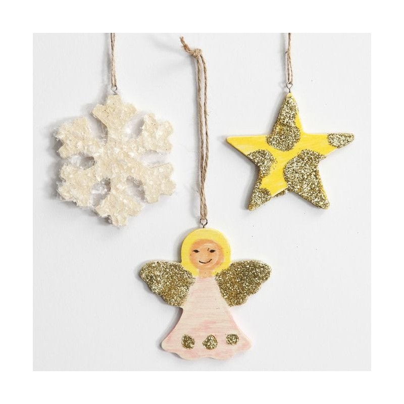 Adornos de madera clara. 6 diferentes diseños Entregado en una caja de 37x37 cm