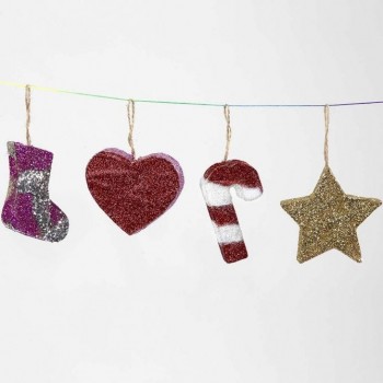Adornos de navidad de papel maché con cordón de yute para colgar. Pack con 6 diseños: Árbol de navidad, corazón estrecho, calcetín navideño, corazón ancho, estrella y bastón de caramelo